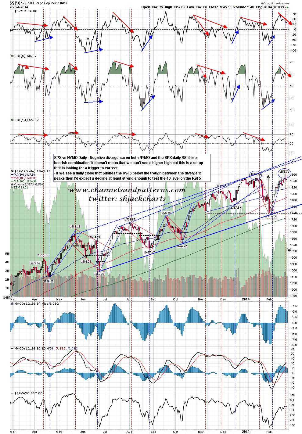 On my SPX vs NYMO and the RSI 5 chart there is clear negative divergence on both, which again looks bearish. The RSI 5 sell signal has not yet triggered by closing a day under the trough between the divergent peaks, but we are one bad day away from that happening. SPX daily chart vs NYMO and RSI: