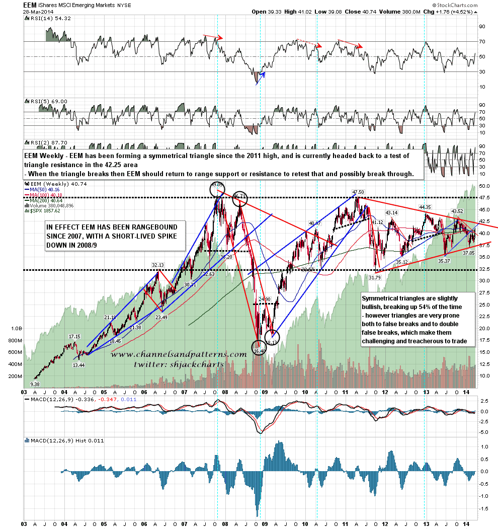On other markets the EEM chart was mentioned to me a couple of times last week, and I’ve been neglecting that chart lately because it has been, and remains, rather uninteresting. EEM has been forming a large symmetrical triangle since the 2011 high, and is moving back towards triangle resistance. The available range within this triangle is now less than 5. I’m also not keen on triangles as I’ve mentioned before and while this triangle is telling us that we should expect to see a test of range resistance at 47.5 or range support at 32.5 in the not too distant future, it’s hard to say which of those is more likely, though I’m leaning long on the basis that the last test of one of those was a test of range support. EEM weekly chart:
