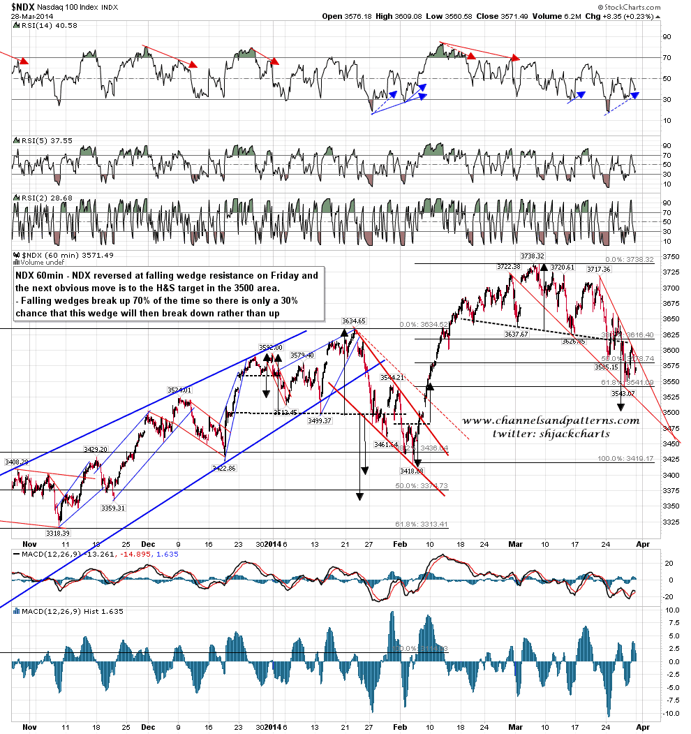 On NDX the H&S target in the 3500 area is now a decent fit with falling wedge support and the obvious next move is to that area. NDX 60min chart: