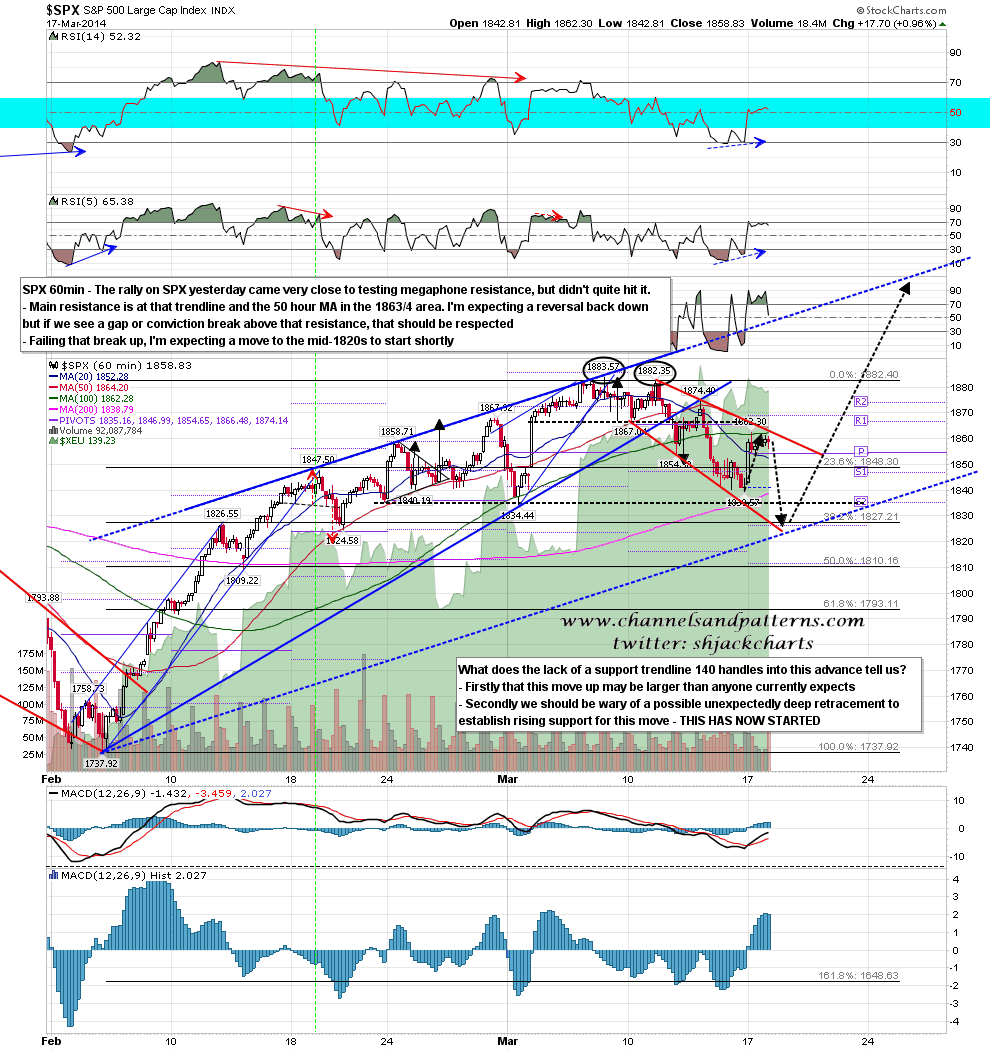The setup is therefore unusually clear this morning. With the 50 hour MA very close to falling megaphone resistance on my SPX 60min chart, a gap over the 50 hour MA is a gap over double resistance there, and if we see that I would expect at least a test of the current highs in the near future. A failure there would strongly suggest a new swing down to test the strong support range around the 38.2% retrace level at 1827. Technically I’m leaning short here. In practical terms however I’ll wait and see what happens at the open. SPX 60min chart: