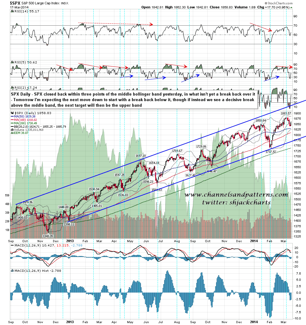 On the SPX daily chart the close yesterday was within three points (above) the middle bollinger band. My downside targets at the 50 DMA and the lower band have not been tested, but a strong close above the middle band today would suggest that they won’t be, and would open up the upper band, currently at 1886, as the likely next target. SPX daily chart:
