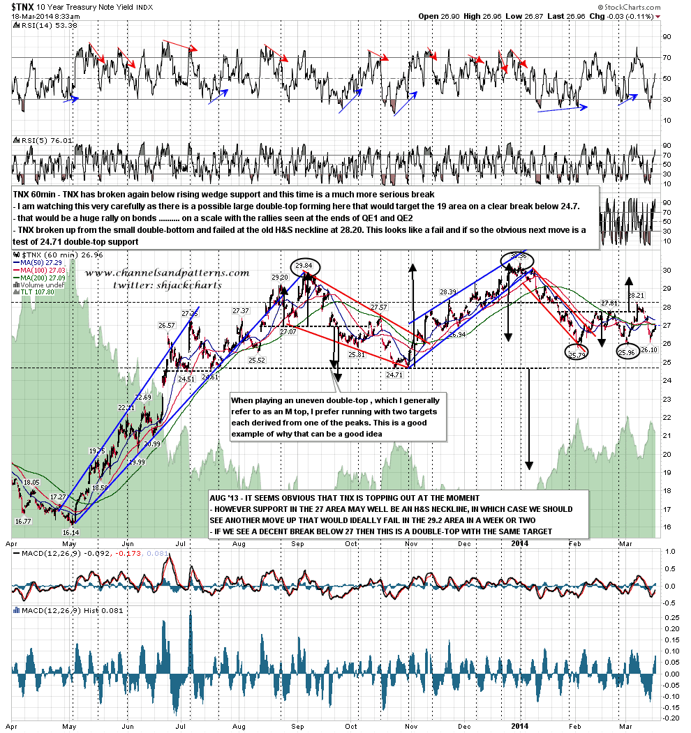 TNX broke up from a small double-bottom targeting a retest of the 2014 highs, and that pattern failed. We may well see a break back down to test major double-top support at 24.71. TNX 60min chart: