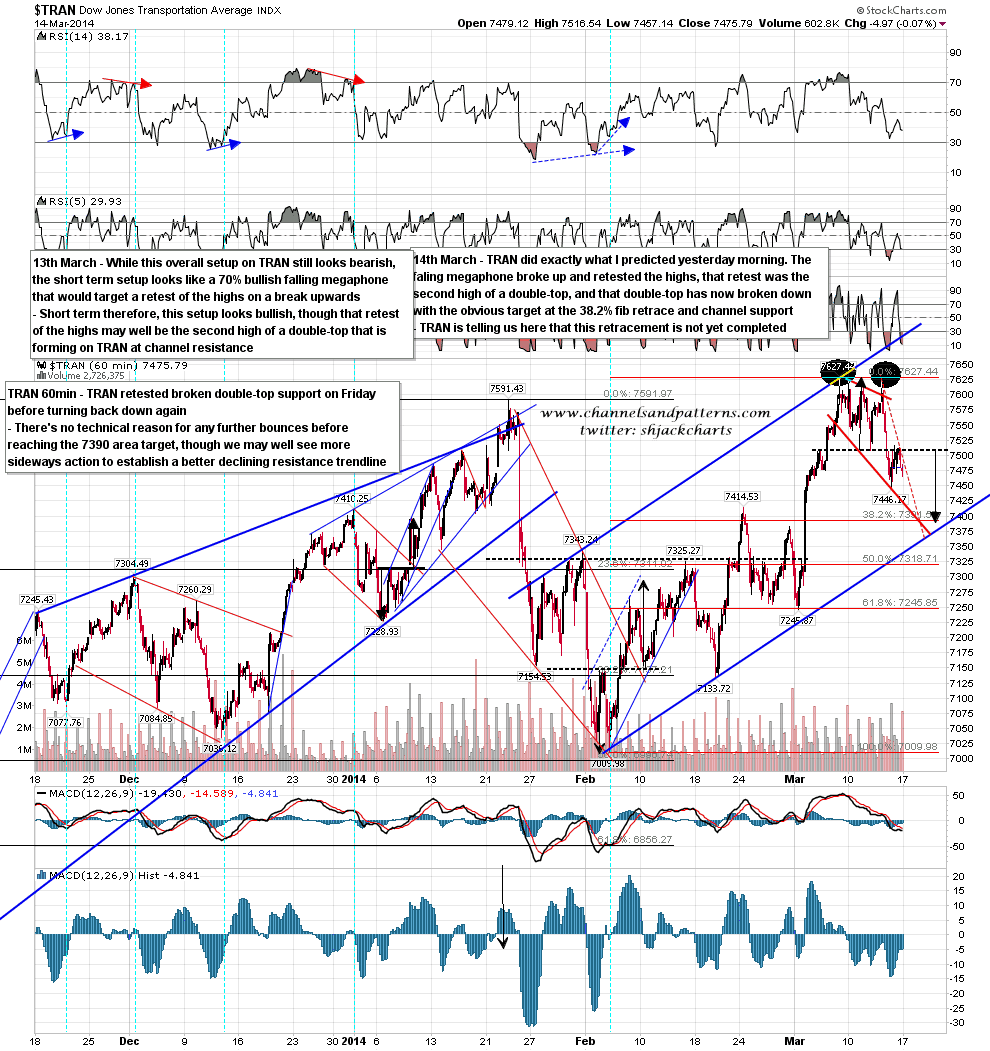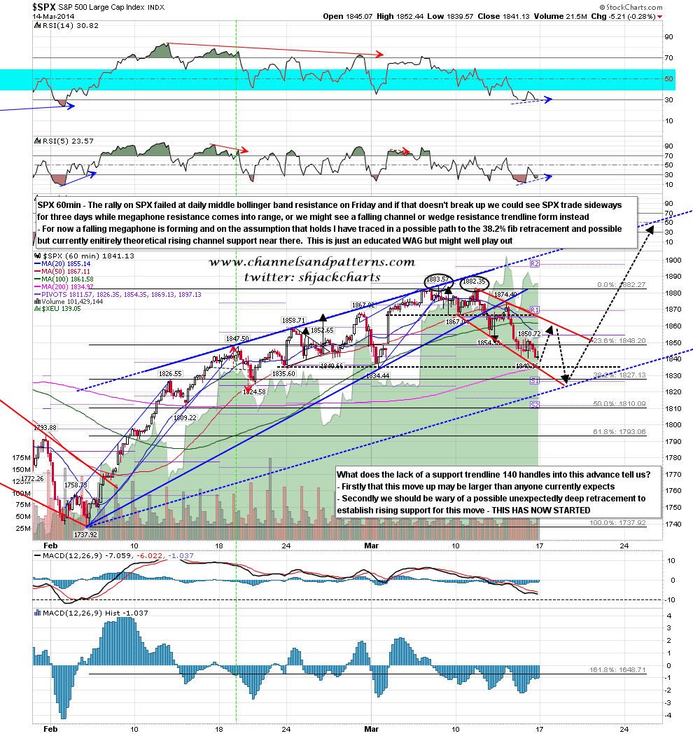 Be that as it may, ES fell at the globex open on the Crimean Referendum result and then more than recovered. The possible H&S neckline that everyone has been watching has been hit, though a hit and reversal there would look much more significant on the SPX chart, and ES has rallied to test the daily middle bollinger band which was resistance on both ES and SPX on Friday. If ES can break back above then the obvious target would be falling megaphone resistance, currently in the 1860 area. ES 60min chart: