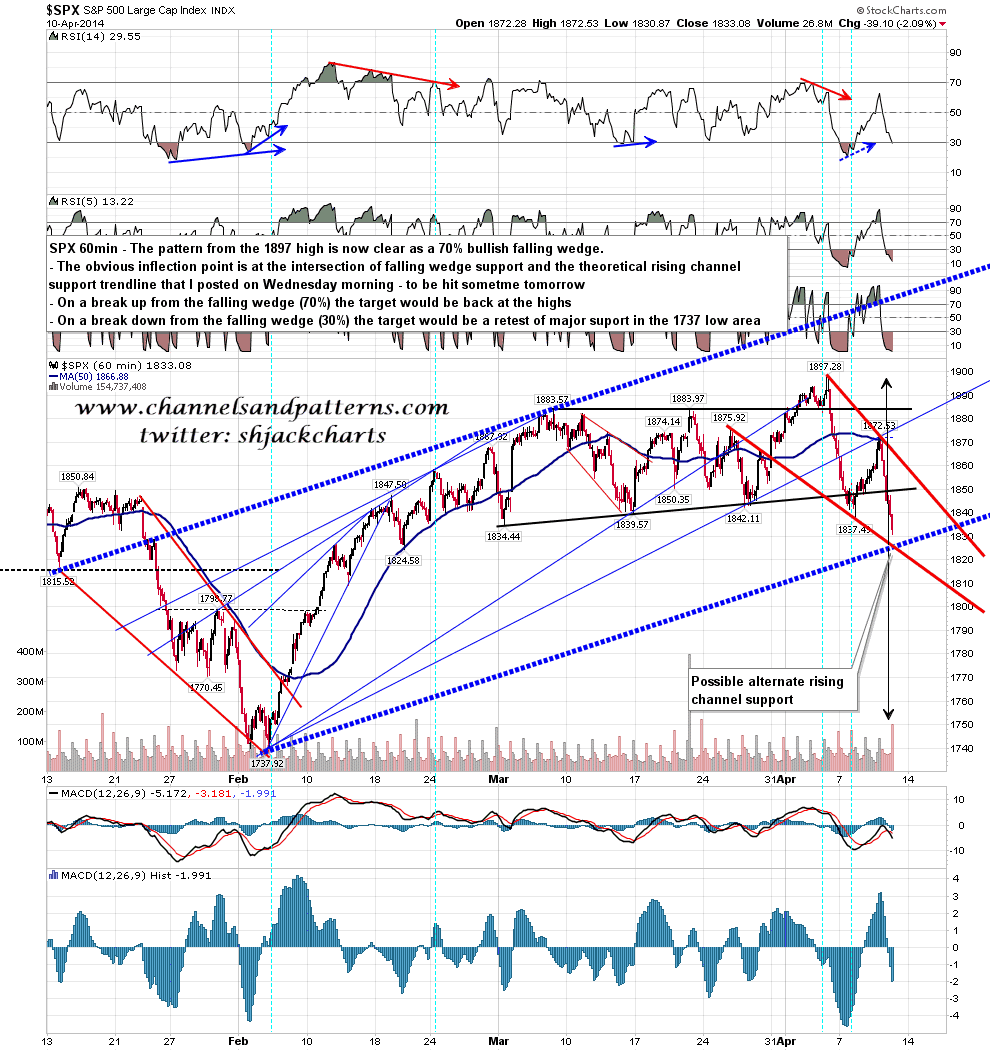 We now have a pattern for this move down from 1897 SPX, and it is a falling wedge. I posted it last night on twitter and here it is on the SPX 60min chart below. You can see that falling wedge support is currently intersecting the theoretical alternate rising channel support that I showed on Wednesday morning, and if this is just another pullback, then the obvious low would be at that intersection in the 1825-7 SPX area today. We could see SPX go lower, as falling wedges sometimes underthrow before breaking up, but the low would need to be a few points lower at most.
