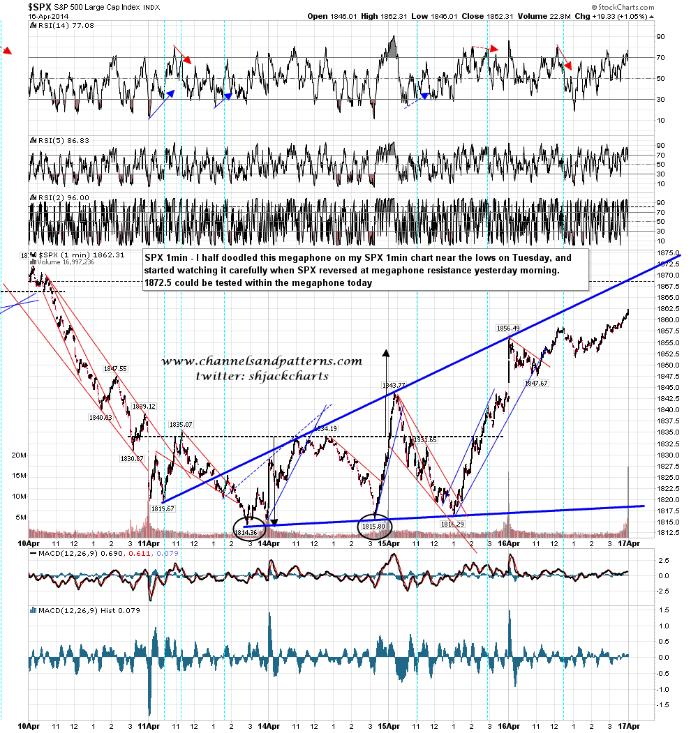 At the low on Tuesday I drew in a half-doodled possible megaphone on my SPX 1min chart. I didn’t mention it yesterday morning but it had my attention after the AM high yesterday was at megaphone resistance. We could see a test of 1872.53 within that megaphone today. SPX 1min chart: