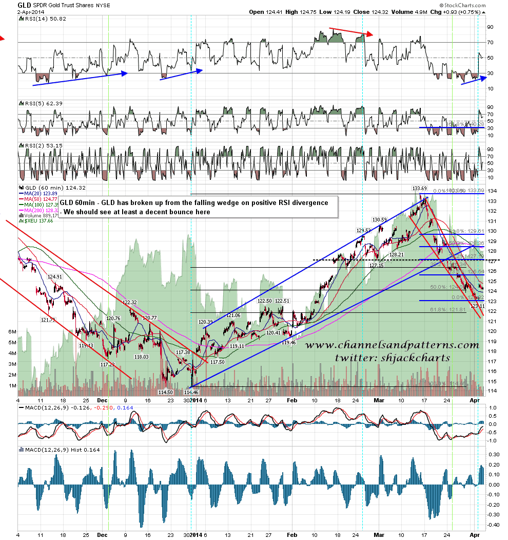 On other markets GLD has broken up from the falling wedge there on decent 60min RSI positive divergence. We might see a retest of the current retracement low but this should signal at least that a decent rally has either started or will be starting shortly. GLD 60min chart: