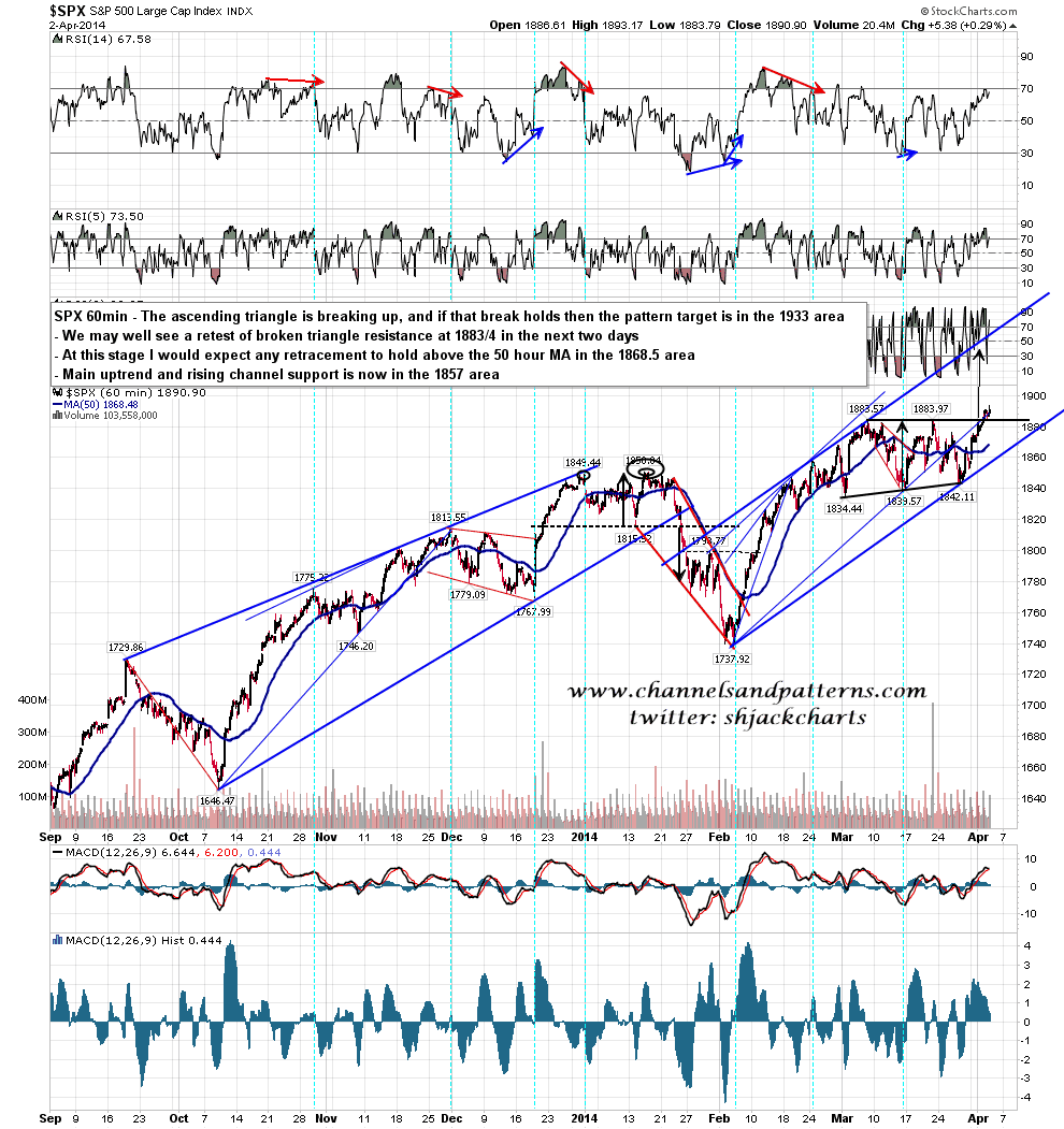 On the SPX 60min chart the ascending triangle has now clearly broken up with a target in the 1933 area. We may well see a retest of broken triangle resistance at 1883/4 today or tomorrow. If that doesn’t hold then there is strong support at the 50 hour MA at 1868.5, strengthened by support at the daily middle band just below. As long as that daily middle band holds as support the bulls are in control here. SPX 60min chart:
