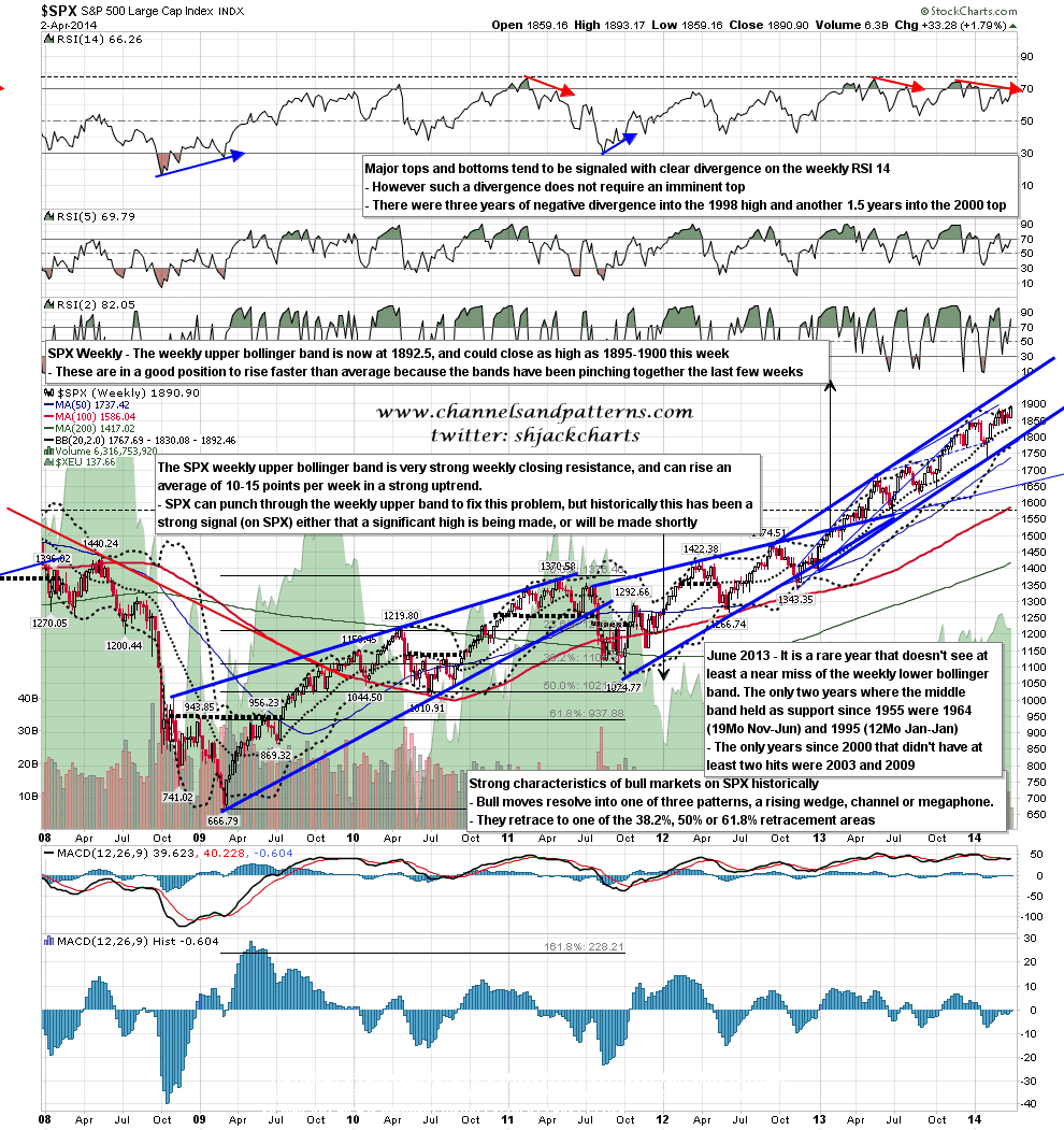 NFP tomorrow is a wild card for any upper band ride of course, and there is strong resistance close above at the SPX weekly upper bollinger band. I am expecting that to close the week in the 1895-1900 area if SPX stays strong, and I wouldn’t expect SPX to close more than five points above there. Next week the weekly upper band can rise another 10-15 points and I would in any case expect the daily upper band ride to finish by Wednesday or Thursday, so there is room here for a ride up lasting several days. SPX weekly chart: