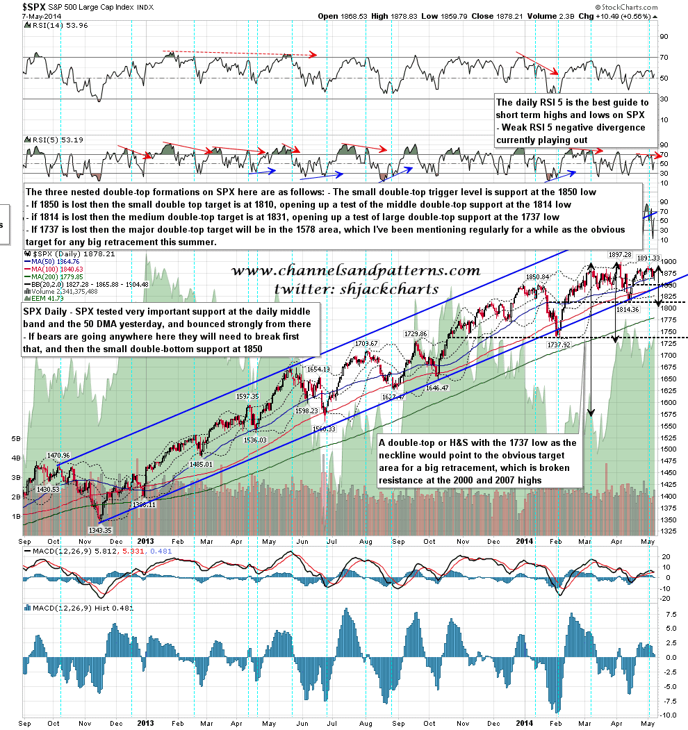 The SPX daily middle band and the 50 DMA at 1864 were tested yesterday and bears managed to get as far as 1859 before a very strong rally began that lasted the rest of the day. Nice recovery from the bulls, and SPX is still stuck firmly in the middle of the current range between 1850 and 1897. SPX daily chart: