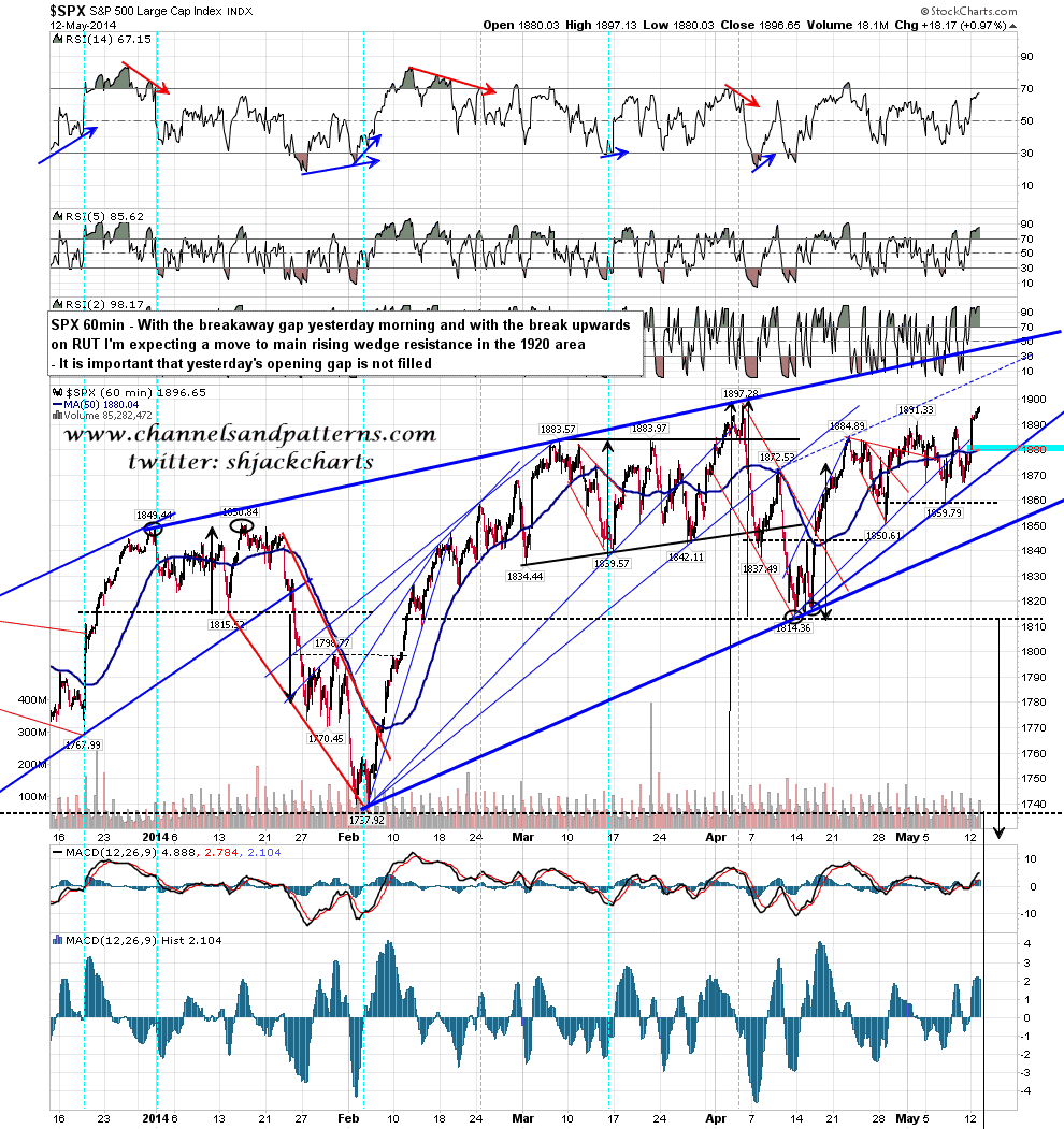 After another look at the SPX chart I have belatedly seen the large rising wedge there coming off the 1849 high and subsequent 1737 low. The next obvious upside target is therefore rising wedge resistance in the 1920, and there should be decent resistance there. It is important for these bull scenarios that the opening gap yesterday morning on SPX is not filled, as it was a breakaway gap which should not be filled until the breakaway move is finished. SPX 60min chart: