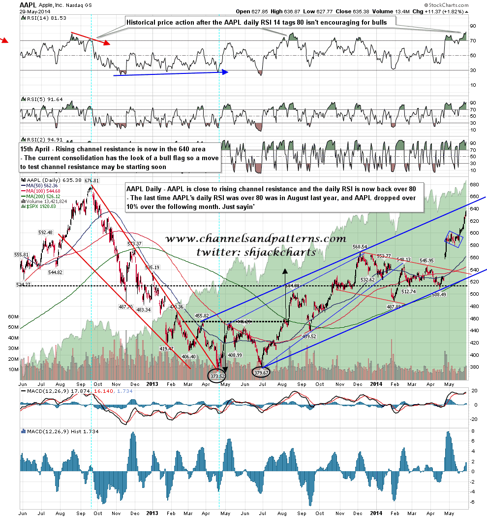 AAPL is approaching the 640 area target trendline I showed as my target on 15th May, and is starting to look like an interesting short. That’s not just due to the channel, as if you look at the daily RSI 14 over the last two years you can see that reaching the 80 level has been a decent stand-alone short signal over that period, and I would note that rising channel support is currently in the 525 area. AAPL daily chart: