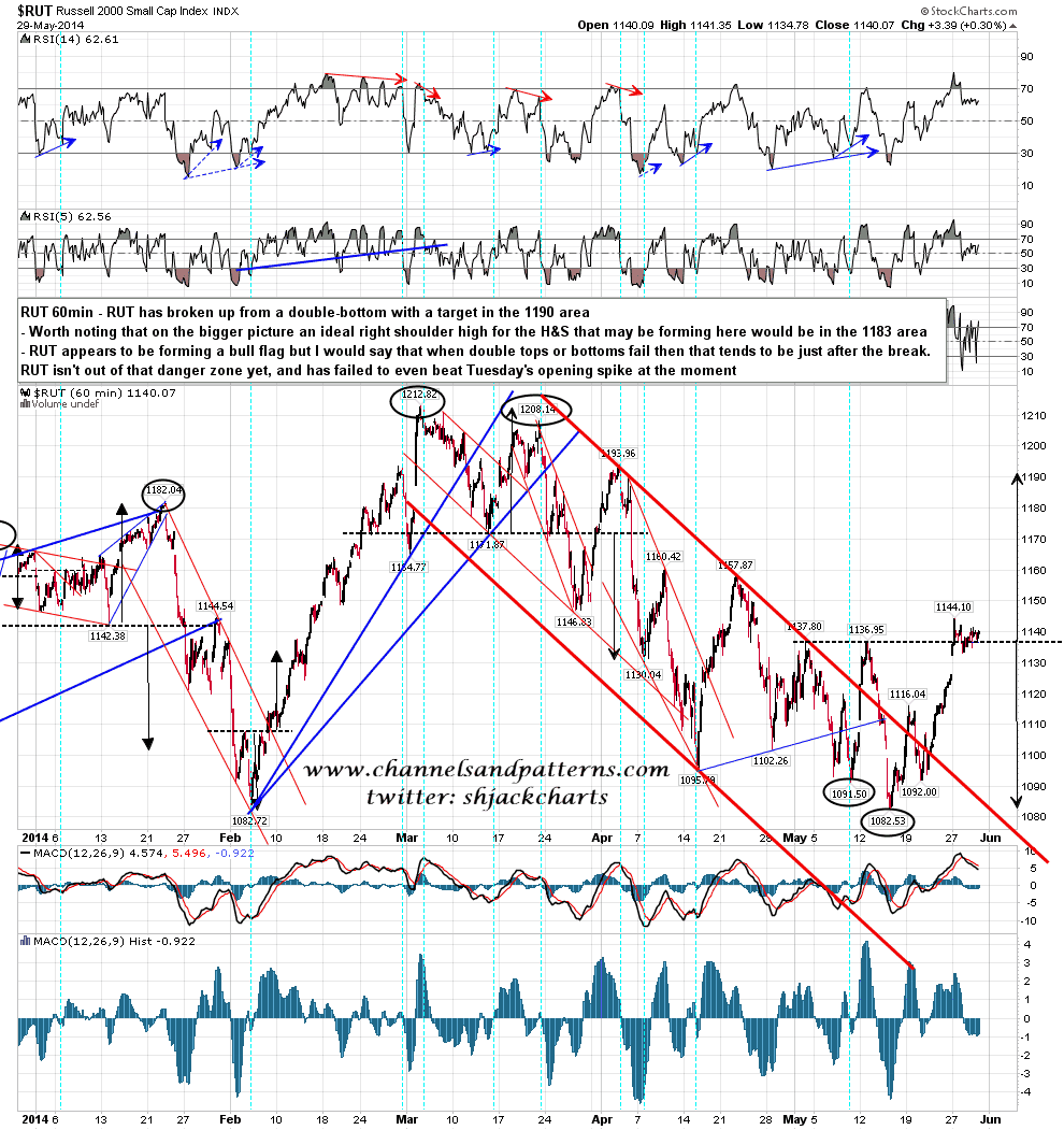 NDX is retesting the current all time high here and this is a possible fail area, though the rising wedge target is still some way above. NDX 60min chart: