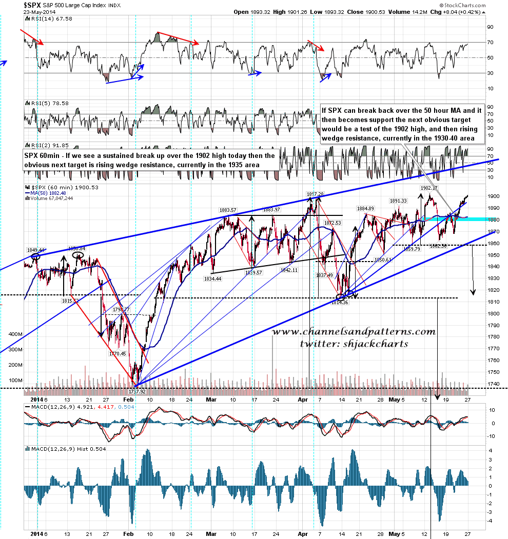 If SPX does break up then I’ll be looking for a hit of rising wedge resistance on the 60min chart. I have that in the 1935 area at the moment,. and rising of course. SPX 60min chart: