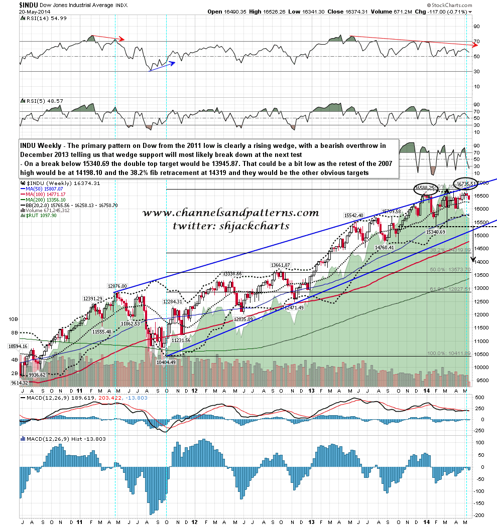 The other thing I hear is that the Fed will never allow a significant reversal. I recall having similar conversations with traders in early 2011 when I suggested that exiting longs as QE2 ended would most likely be a smart move. That view was wrong then, and with QE3 winding down rapidly here, most likely wrong again now. The obvious reversal setups that I have shown on SPX are also forming on most other US indices and the very nicely formed example below is son Dow, which like SPX has a big reversal setup targeting a retest of broken resistance at the 2007 high, which I was saying a year ago was the obvious target for any big retracement. INDU weekly chart: