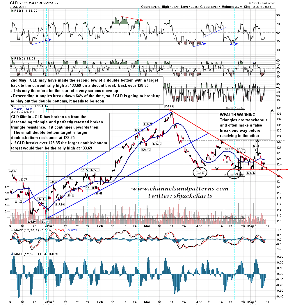 The last chart for today is the GLD 60min chart where the retest of broken triangle resistance is still ongoing and looking good so far. If that holds then we should see a very decent move up on GLD starting soon. GLD 60min chart: