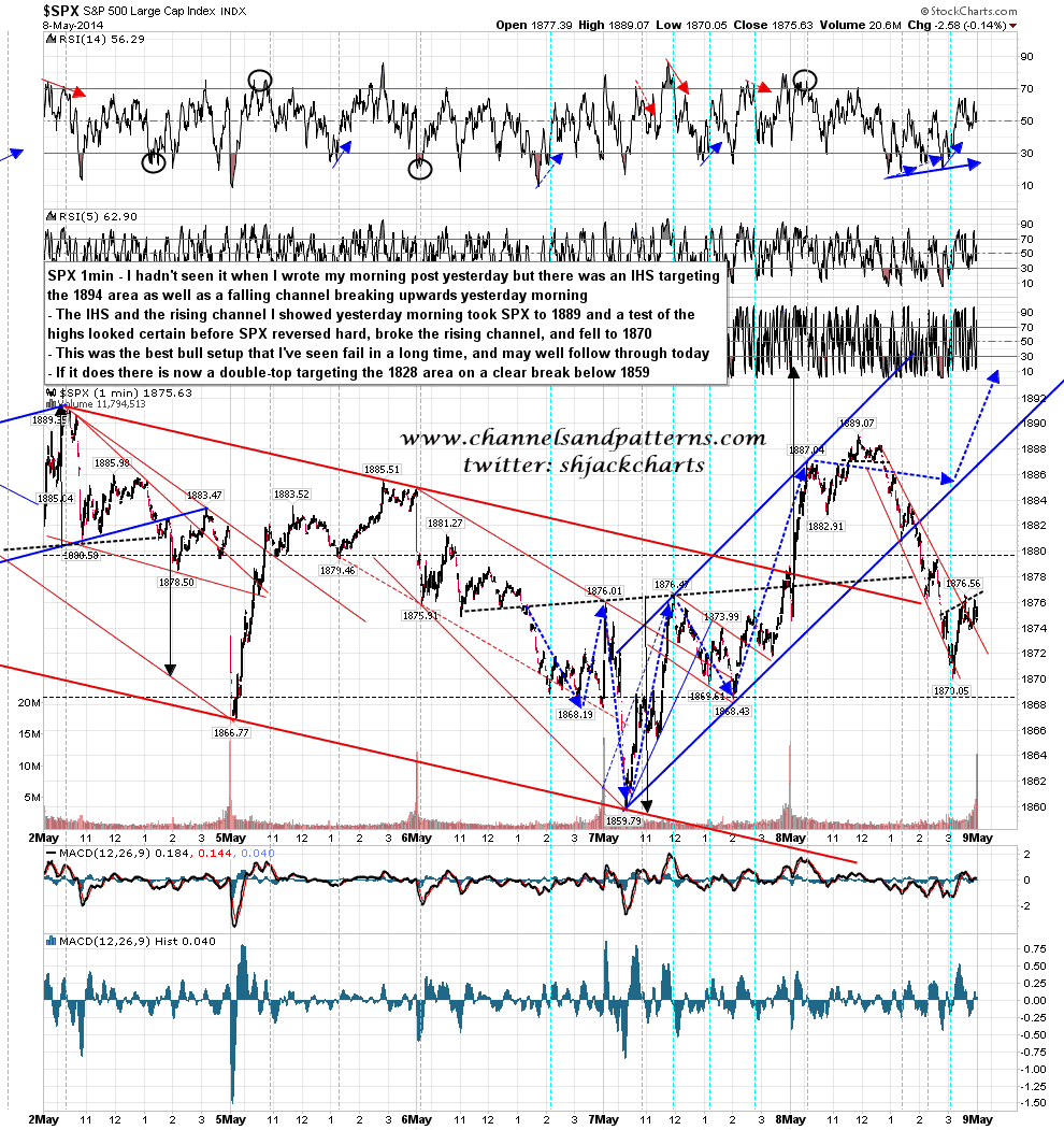 The setup the bulls had into the highs yesterday was just beautiful. The rising channel on the chart I posted yesterday morning held perfectly at the AM high, and the IHS that I missed yesterday morning, but saw soon after the open targeted 1894 SPX for an effective test of the high. That test of the high looked like a done deal unless the rising channel broke, which looked unlikely as long as the IHS target area hadn’t been reached. This was a really very strong setup for the bulls to retest the highs and try to break up, and they blew it really badly. SPX 1min chart: