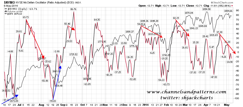 NYMO divergences against SPX have been a decent guide to significant highs and lows. There isn’t always a divergence, but when there is it’s well worth noting. There is a strong negative divergence here. SPX daily vs NYMO chart: