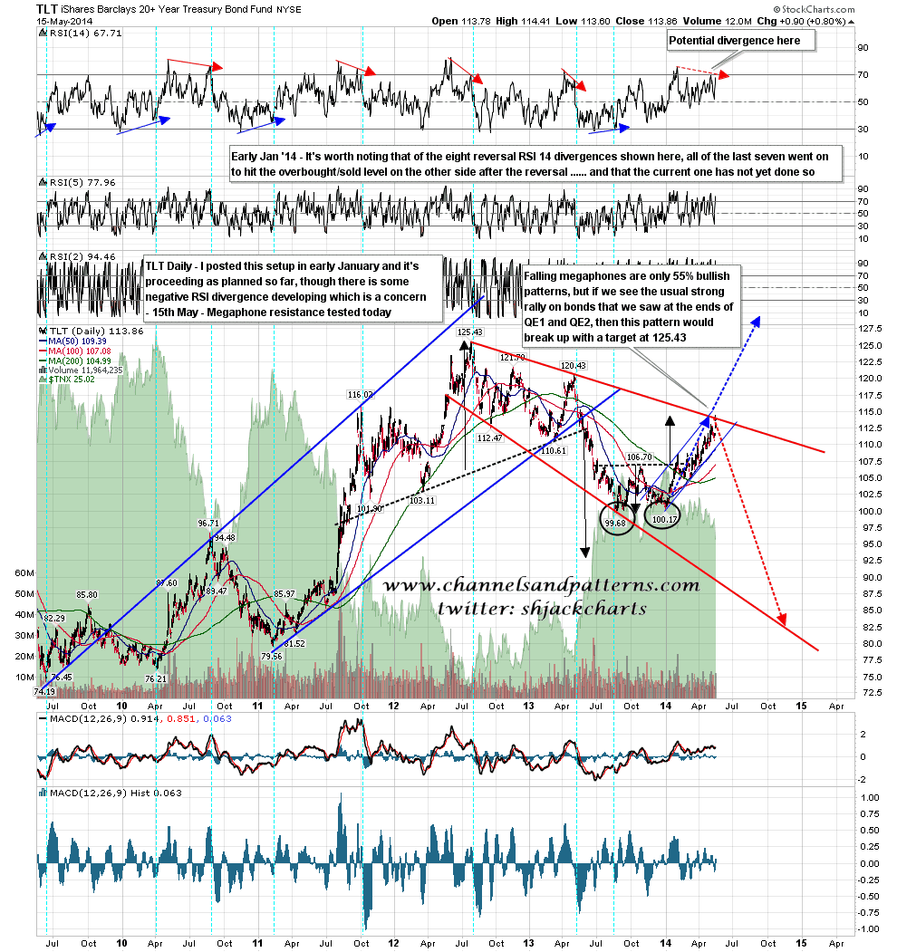 On the TLT projection I did at the same time, though not posted then, I was looking for a move to broadening wedge resistance and after four slow months of inching towards that it was reached and very slightly broken yesterday. I’m leaning towards a break down on TNX and break up on TLT here, and if we see that I’ll do another projection for the next few months. That may not be quite as accurate as my January projection which was so close in price and time that I never even had to adjust the arrows. TLT daily chart: