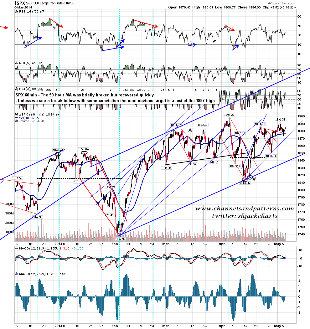 On the SPX 60min chart the 50 hour MA was also broken at the open yesterday, but swiftly recovered. That is first support, and there is now a strong rising support trendline in the 1870 area. That is now important support and a break below that would be a sign of real weakness. SPX 60min chart: