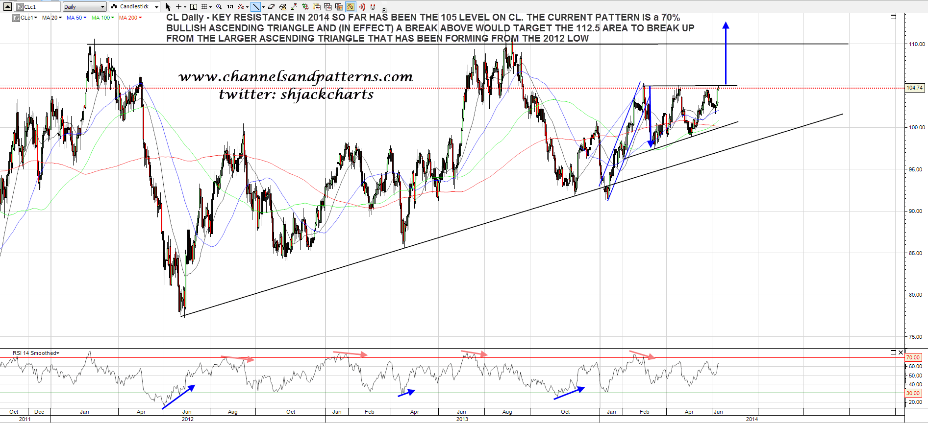 CL is back testing the 105 area, and that has been resistance all year. There is an obvious (70% bullish) ascending triangle on CL here so the odds would generally favor a break up. I’d put the odds a of a break up lower here, if only because there is an unresolved daily RSI divergence here, and these are generally very good at delivering declines on CL. At best though that would shift the odds to 50:50 in my view. CL daily chart: