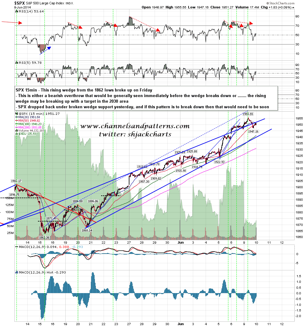 The smaller rising wedge from the 1862 area low has also broken up, and dropped back below broken wedge resistance yesterday afternoon. If that could break down now the short term technical prospects for bears would improve considerably. SPX 15min chart: