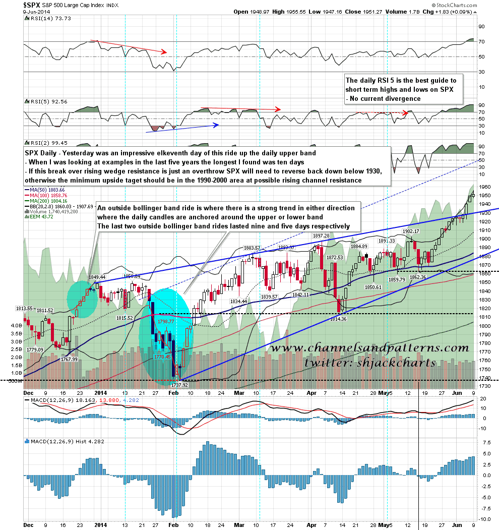SPX broke over resistance on the rising wedge from 1737 last week and while this may still be a bearish overthrow, SPX would need to break back below broken wedge resistance (1930 area) in the near future. Alternatively the wedge may be evolving into a channel, but in that case I would expect to see at least a test of 2000. SPX daily chart: