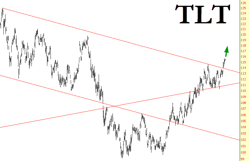 At the same time, naturally, bonds have been strengthening. The move above the descending trendline was the “all clear”, and bond bulls are probably in for happy times ahead.