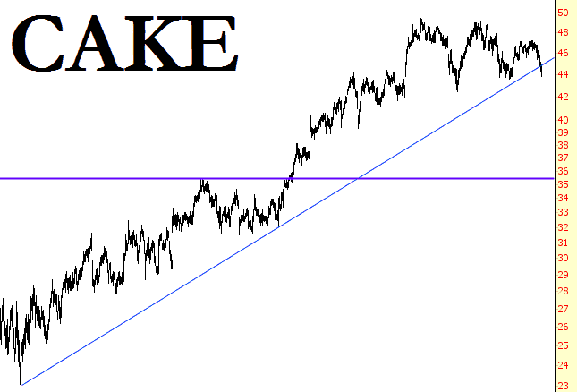 Cheesecake Factory (whose mission is to make our morbidly obese nation even more morbid) has broken an important uptrend as well.