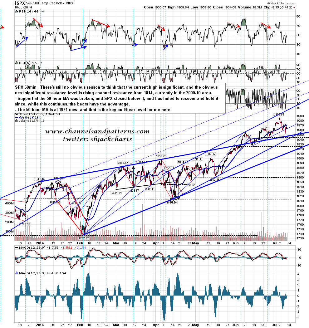 Just above channel resistance is the key bull/bear level for me at the SPX 50 hour MA. That is at 1971 at the moment and if bulls want to turn this back up, then they need to take that back and hold above it, which is what they tried and failed to do on Wednesday. If they can break the last short term high at 1974 with any confidence then the next target should be another test of the daily upper band . SPX 60min chart: