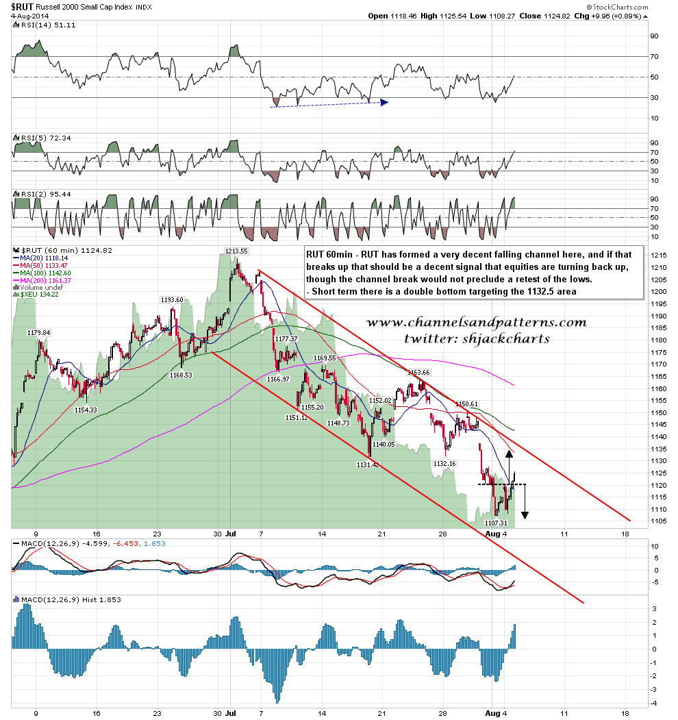 The falling channel on RUT favors a hit of channel support in the 1082-90 area before the next hit of channel resistance, but there is also a small double bottom on RUT targeting the 1132/3 area. As with SPX though, broken double bottom resistance at 1120 needs to be respected and a strong break back below it would seriously weaken the pattern. RUT 60min chart: