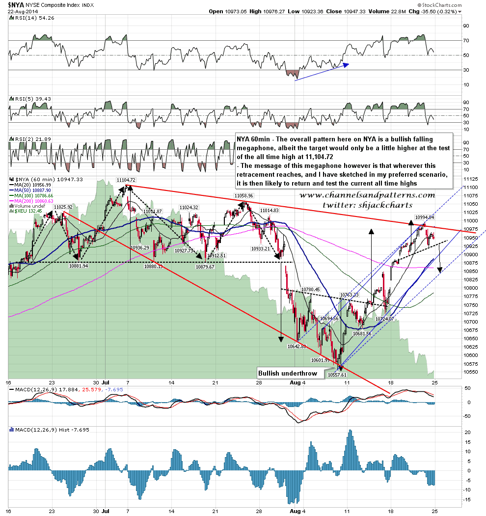 I’ve included the NYA chart this morning as this may be a useful indicator early this week. The overall pattern on NYA is a very nice looking falling megaphone from the high, which is very likely to break up soon with a target at a test of the current all time highs. That’s because as well as being a bullish leaning pattern, the megaphone also did a bullish underthrow at the last low. As long as NYA doesn’t break up and make that target this morning, any retracement here is very likely to reverse back up afterwards to make that target. Obviously that megaphone may break up and make target today, in which case that reassuring unmade target would be lost. NYA 60min chart: