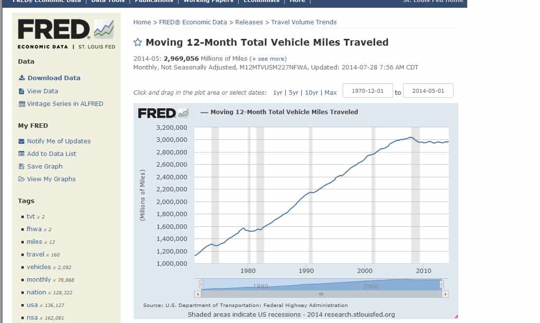 Will highway traffic become even heavier, to the point that reservations are needed before you are even allowed to get on an interstate, or have we hit a limit and traffic is never going to get any worse than it is now? Much has been made of the graph below. Is the lull in traffic temporary or permanent? I suspect it is temporary, but we’ll see in a few years. Not everyone is quite as optimistic, and this analysis is worth noting: http://advisorperspectives.com/dshort/updates/DOT-Miles-Driven.php