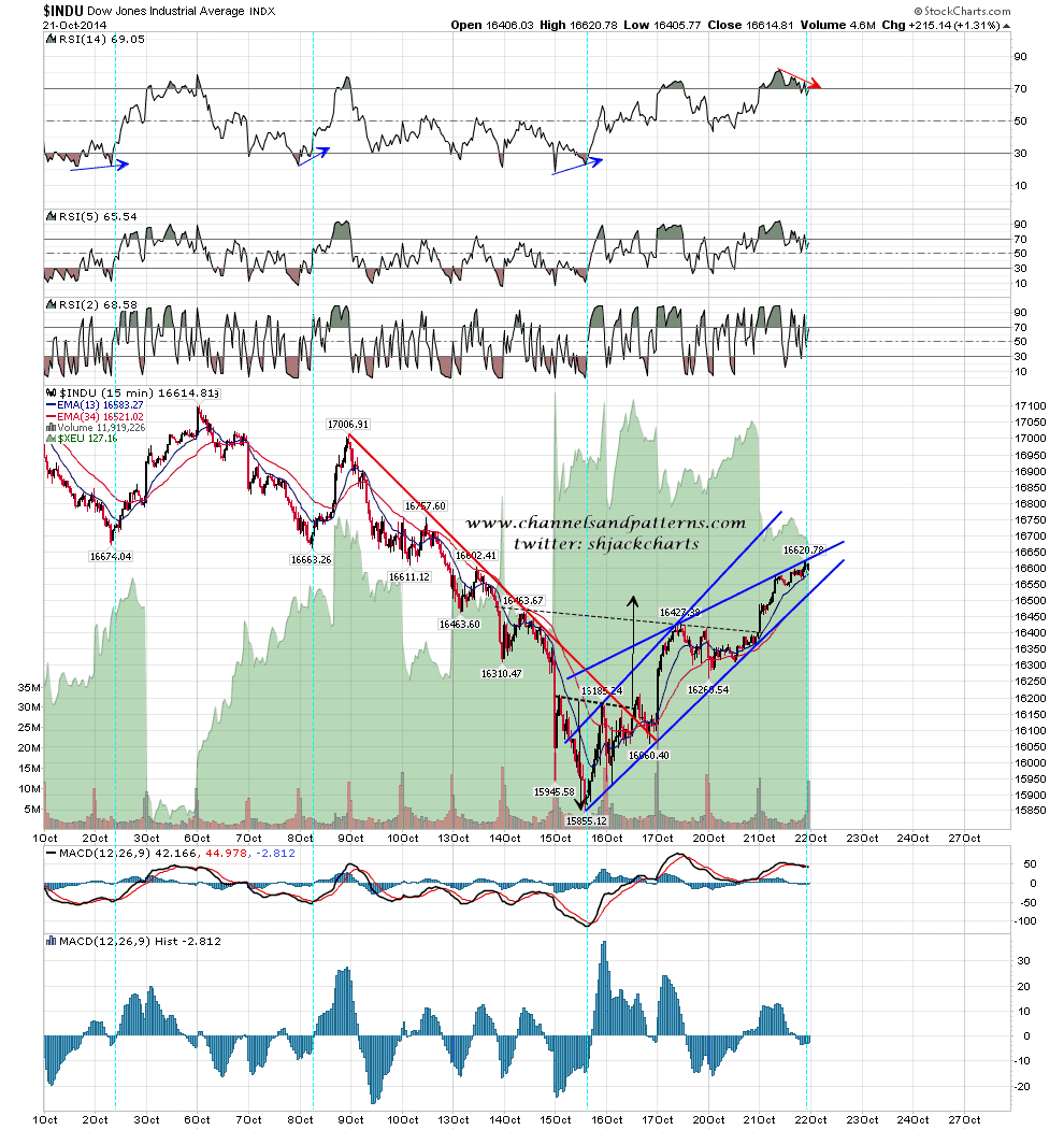 Dow is either forming a rising wedge or megaphone. I’m leaning towards a wedge but we should find out this morning. INDU 15min chart: