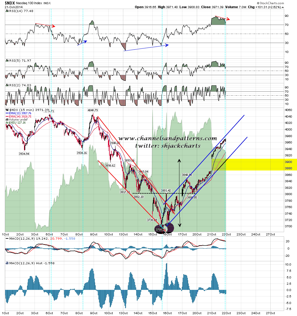 There is a very high quality rising channel here on NDX. NDX 15min chart: