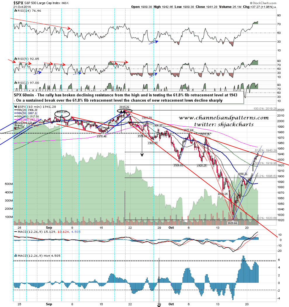 Yesterday went pretty much as I expected, except for the direction of course, which was up rather than down. There were an impressive list of bullish breaks over the course of the day, starting with the gap back over the 200 DMA, then a break over the 50% fib retracement level at 1920, the daily middle band (closed at 1933), and the day closed at the test of the 61.8% fib retracement level at 1943.