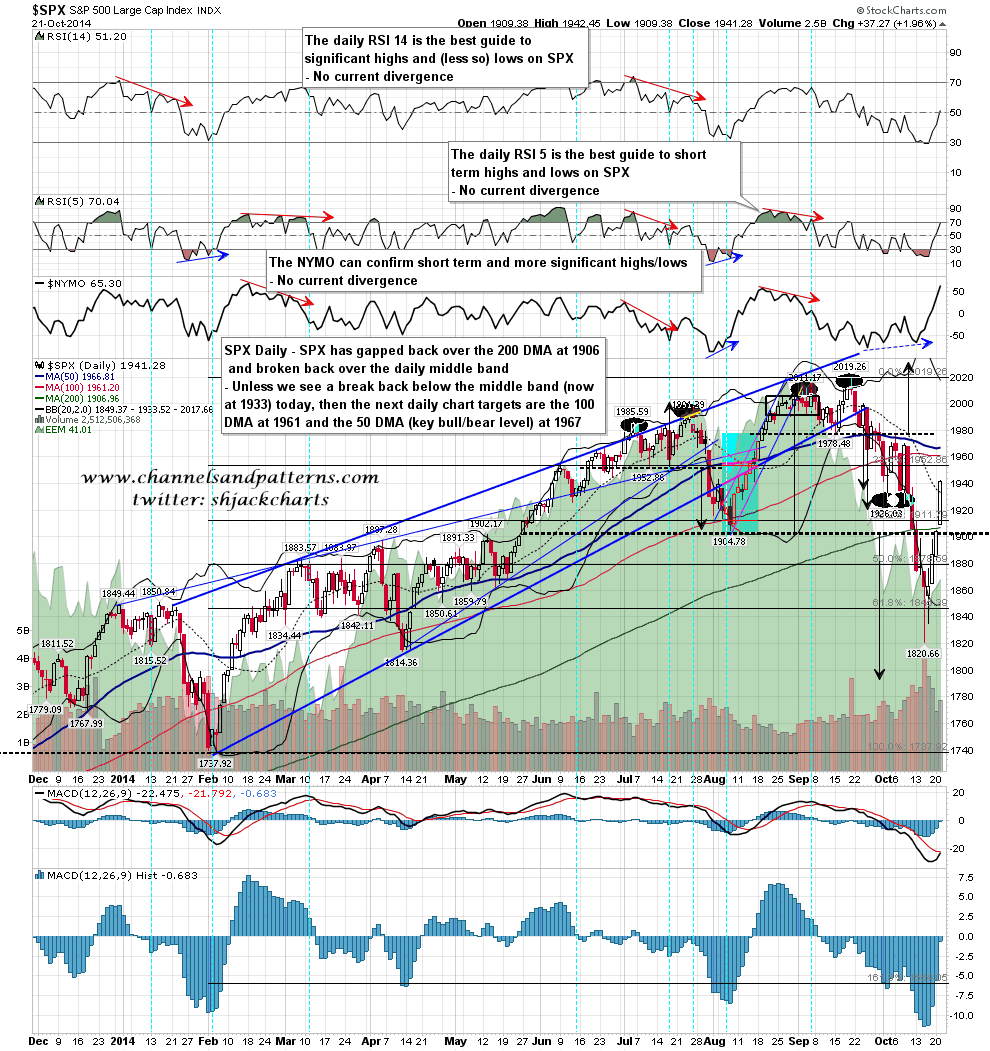 There is one more big resistance level above, and that is the very important 50 DMA at 1967, but in practical terms any sustained break over the 61.8% fib retracement level at 1943 will greatly increase the chances that the retracement low was made at 1820, and on a sustained break over the 50 DMA, there would be a clear target back at a test of the 2020 highs. SPX daily chart: