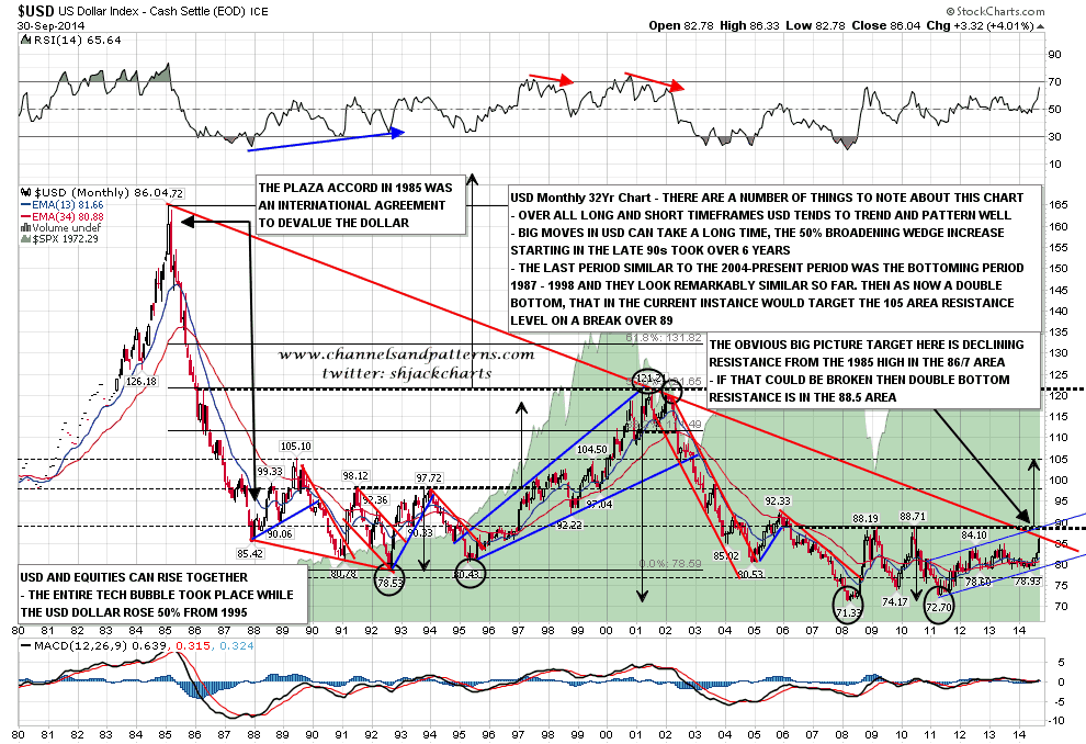 I’ve been posting this long term USD chart for a couple of years now, talking about the possibility that USD might test the main declining resistance trendline from the 1985 high, and perhaps break up through it, and that trendline was finally tested yesterday. That is one of two strong resistance levels on USD here, the other is in the 88.50 to 90 area if USD doesn’t reverse here. USD monthly chart: