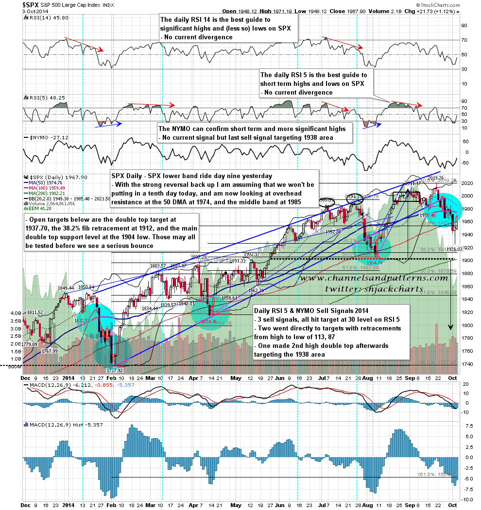 On the daily chart Friday was the ninth day of the lower band ride and, assuming that we don’t see a very strong reversal today, the last day of that lower band ride. Overhead resistance is at the 50 DMA at 1974, and the middle band at 1985. My ideal high here, obviously on the bear scenario, would be for a high to be made today or tomorrow, with SPX opening and closing the day at or under the 50 DMA, with an intraday test of middle band resistance at 1985. SPX daily chart: