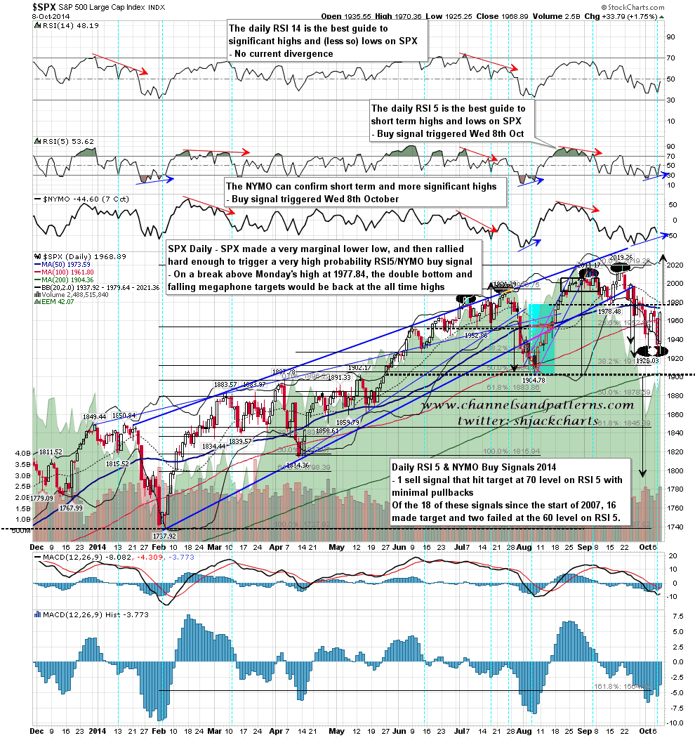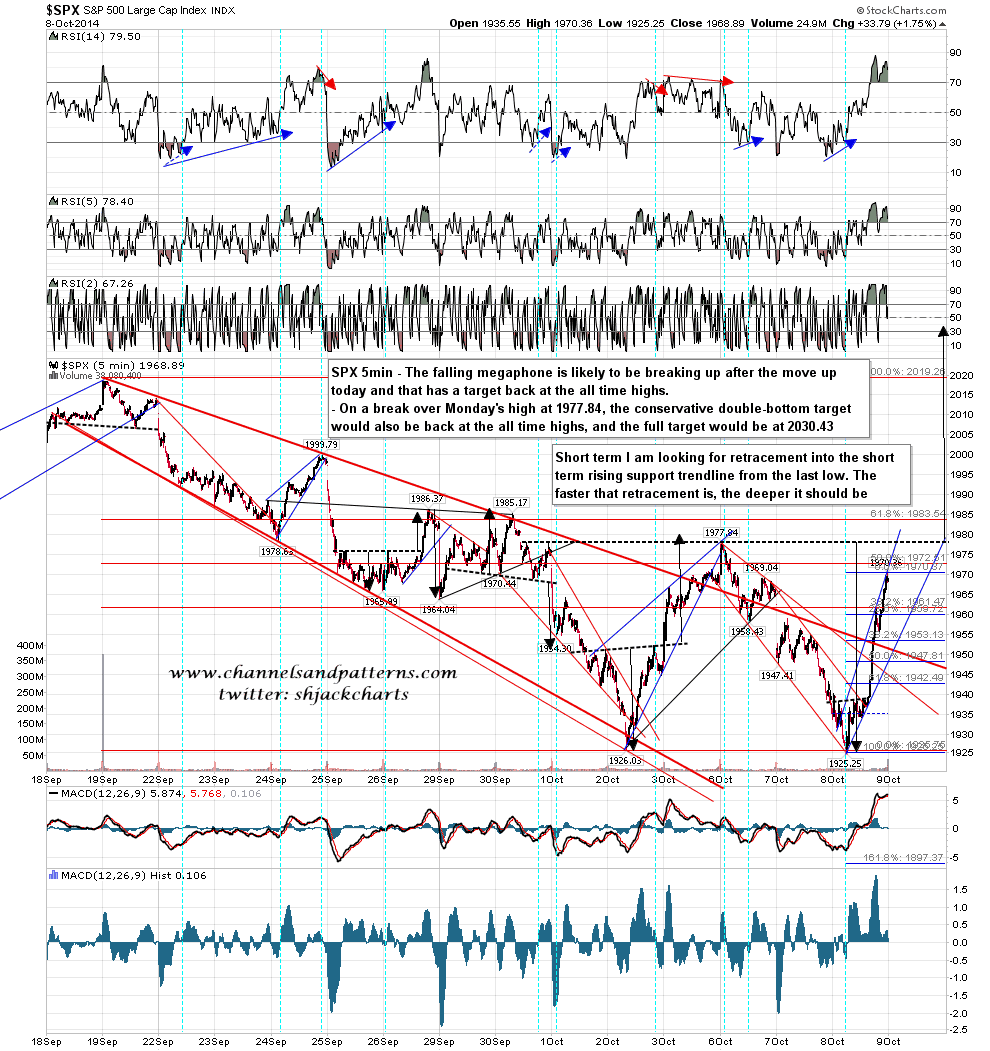 So what is the pattern setup in the context of that daily buy signal? Well with that strong break back over falling megaphone resistance I now have a target there back at the all time high on a break over Monday’s high. On a sustained break over that Monday high I would also now have a double bottom target with a conservative target back at the all time high, and a full target at 2030 SPX. My daily buy signal is telling us that a break over Monday’s high is very likely, and is supporting, with sixteen examples out of the last eighteen, that SPX will make a decent try at testing the all time high next. SPX 5min chart: