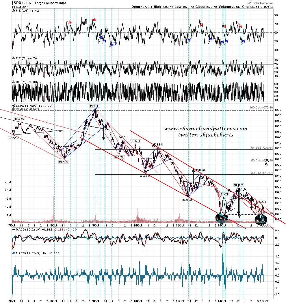 At the time of writing however, ES is some 22 points below the close yesterday and that’s not so bullish. If ES can recover to yesterday’s low area then this bounce setup still has a decent shot, but if not then this setup may just be steamrollered by the greater trend downwards. Furthermore if we should now see a break under falling wedge support then I may get a new bear pattern target looking for the low 1700s. I’ll be watching that carefully today. SPX 1min chart: