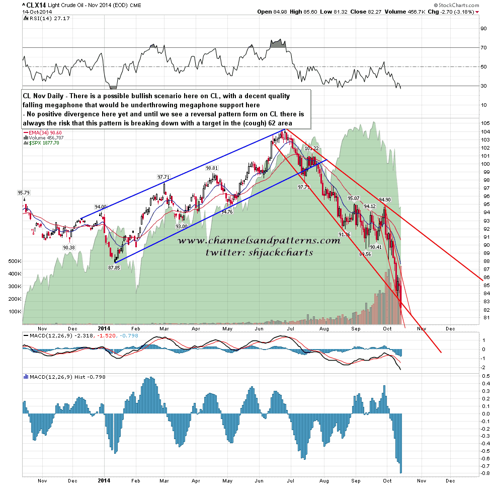 I said before regularly that when a trend begins a channel is often formed quickly which then evolves into a wedge or megaphone. That may have happened on CL here with the initial falling channel evolving into a falling megaphone. If so then that megaphone has two options here. The first (70%ish odds) is that CL is making a bullish underthrow before breaking up. The second (30%ish odds) is that CL is breaking down with a target in the 62 area. I should mention that this isn’t the only setup on CL targeting the 60s and while I’m finding targets there a little hard to take seriously still, they are an option here. CL could go either way at this inflection point. CL daily chart: