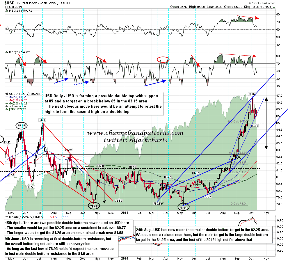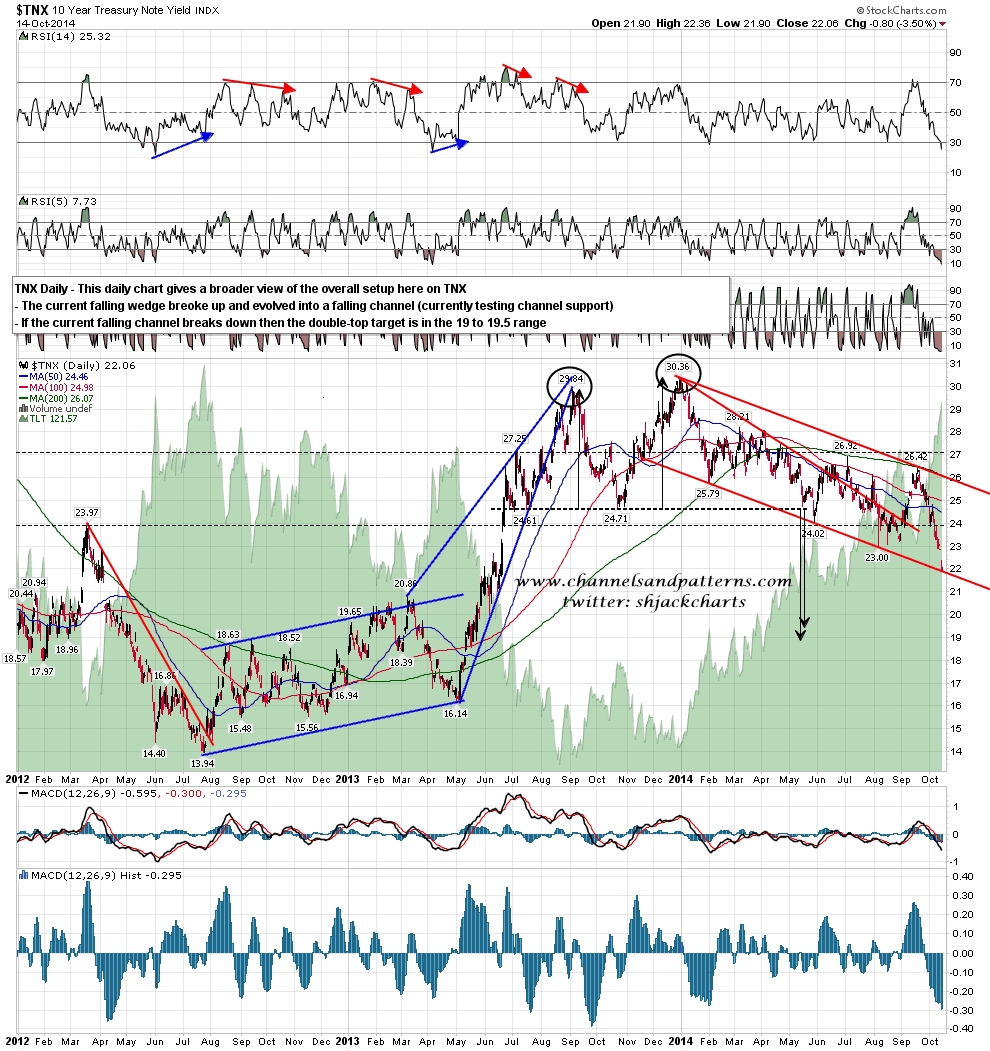 So where does this leave the bounce I was looking at yesterday morning? Well a bounce here is counter-trend and inherently risky, but the technical setup development was decent yesterday with the falling wedge breaking up, and then forming a nice looking possible double bottom that targets the ideal rally target area that I was looking at yesterday morning.