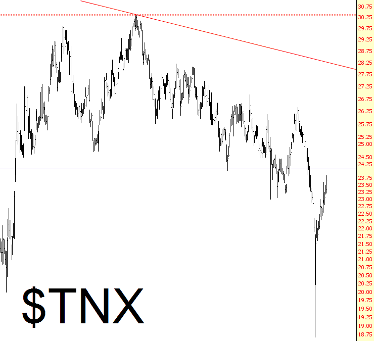 Obliquely related to that is interest rates: my view is that interest rates are going to fall, and they’re going to fall hard. Our friends in Gainesville keep stating how interest rates are going to skyrocket. I’m just a simple chartist, not a wave-head, so I just don’t buy it. Here’s the ten-year yield:
