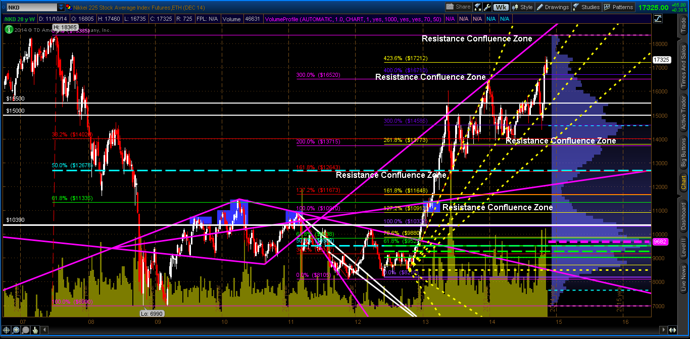 As I reported in this recent post on Japan’s Nikkei Futures Index, price has entered “froth” (major resistance) levels seen in the beginnings of the 2007/08 financial crisis. As of tonight (Tuesday), price has held above the “line-in-the-sand” level of 16,666 and is now trading at 17,325, as shown on the Weekly chart of NKD below.