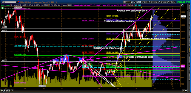 Volumes spiked on November 4th after retreating from a high of 17,480 set on the 3rd and have been subdued since that day (including today). Watch for a climb and hold above 17,480 to the next confluence resistance level of 18,365…if we see a build in volumes approaching that level, we may see a continued push above resistance…if not, or if volumes decline, this may signal that a formidable decline is imminent somewhere in between 16,666 and 18,365 down to, potentially, 15,000, 13,700, or 12,600 (or even lower). In any event, we may see increased volatile and large overnight and intraday swings occurring in between those levels for awhile until a firm direction is established.