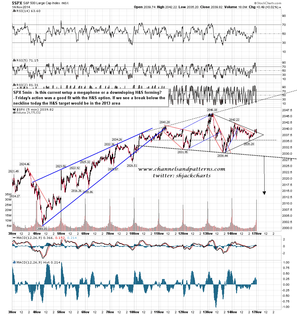 In terms of a retracement target the H&S that I posted on Friday looks pretty good here and if the neckline breaks today the target would be in the 2013 area. SPX 5min chart: