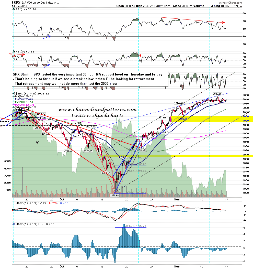 To get a retracement started SPX must first break below the 50 hour MA, which was strong support on both Thursday and Friday. If we see a decent break of that today (hourly close basis), then a retracement should be starting. SPX 60min chart: