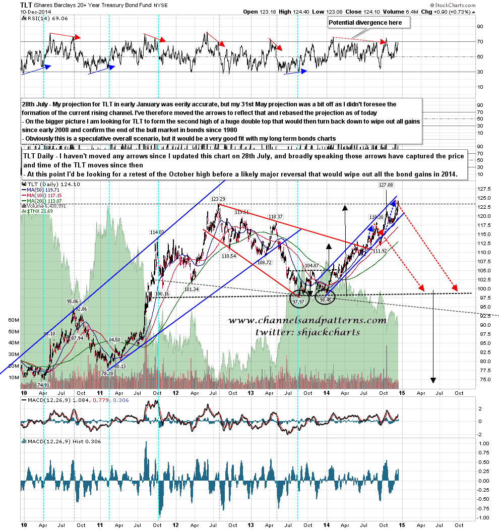 I haven’t posted a TLT chart in a while and with the current rally there it’s time to review my last forecast in July, which has performed decently. The obvious next step is to retest the October high and at that retest there is a major inflection point. What I am expecting to happen is a reversal that would then wipe out all gains on bonds in 2014 to test support on a large double top that on a break down would then target a full retracement of all gains on bonds since the 2009 low.