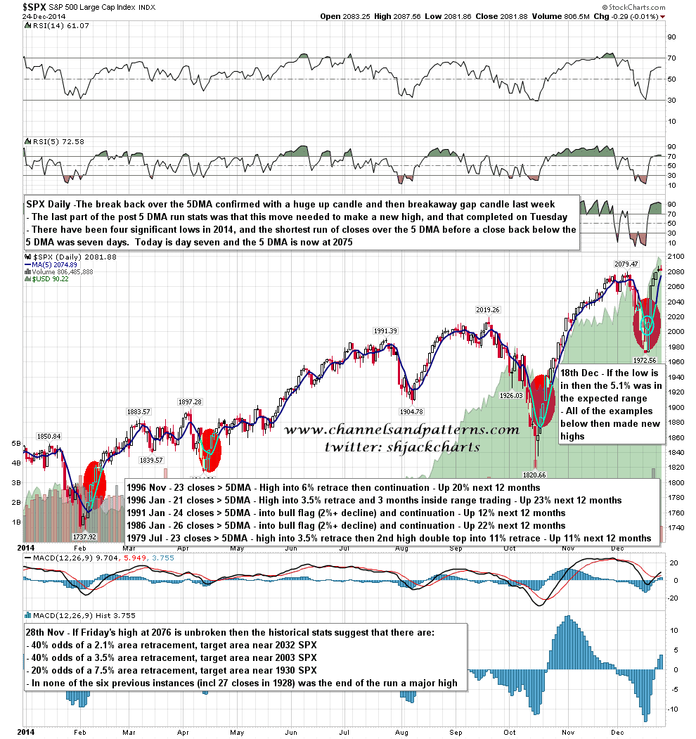 The playing field becomes more even next week as volume comes back into the markets. Monday and Tuesday have neutral stats and the stats for Wednesday as the last trading day of 2014 are strongly bearish. If we see 2077 today I’ll be a buyer there.