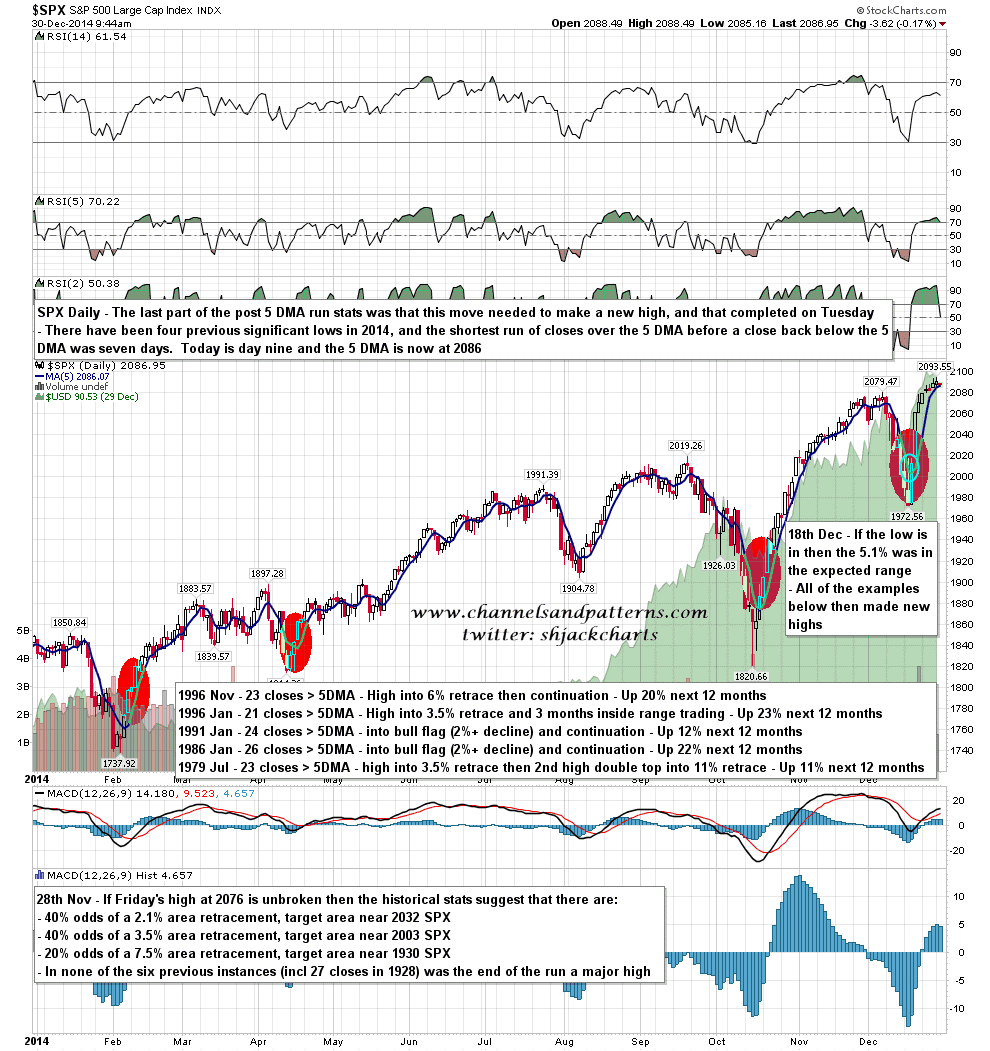 There has been a strong daily intraday setup since Xmas Eve of an early push higher followed by weakness near the close and overnight. That early push up has been slow to get going this morning but if we are going to see any real retracement this week the odds strongly favor tomorrow for the main part of that retracement. If we do see a push up today then I’ll be looking for short entries this afternoon to take advantage of the strongly bearish stats for tomorrow.